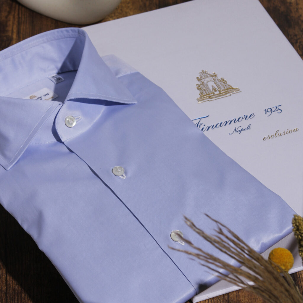 Finamore was founded in 1925 in Naples, in a small workshop where shirts were sewn entirely by hand. The maison continues this tradition today, preserving techniques passed down through generations: hand-attached sleeves, sculpted collars, hand-stitched buttonholes and mother-of-pearl buttons.